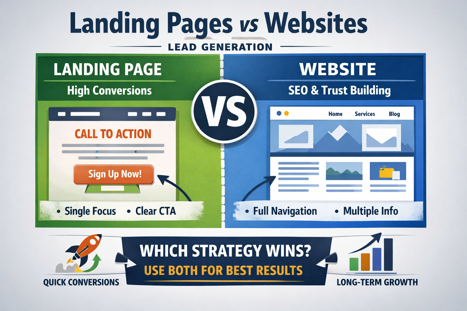 Landing pages generate quick wins. Websites build sustainable growth.